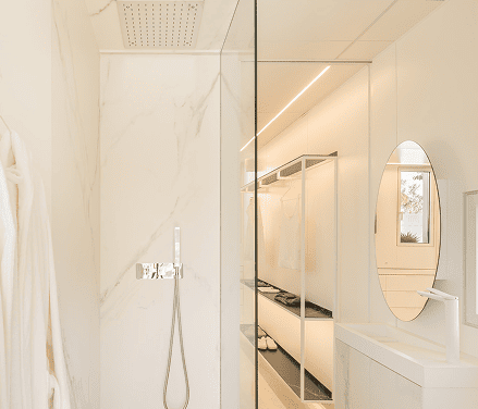 (Floor-to-ceiling shower enclosure with niche)